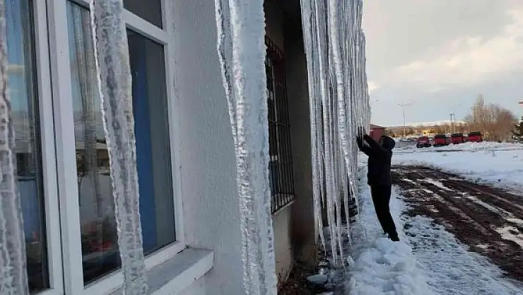 Ardahan ve ilçelerinde etkili olan kar yağışının ardından etkisini göstermeye başlayan dondurucu soğuklar nedeniyle çatılardan yaklaşık 3 metrelik buz sarkıtları sarkmaya başladı.