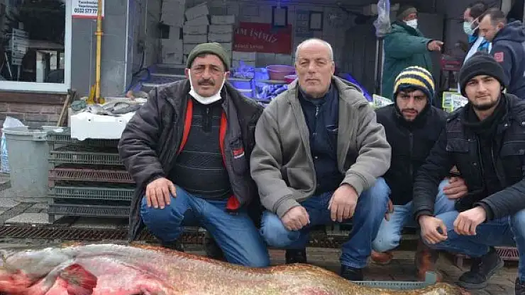 19 Mayıs ilçesinde balıkçı tezgahında 103 kilogram ağırlığında ve 3,5 metre uzunluğundaki dev yayın balığı satışa sunuldu.