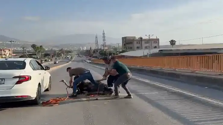 Hatay'ın İskenderun ilçesinde çiftlikten kaçıp, caddeye çıkarak araçların arasında koşan deve kuşu, cep telefonuyla görüntülendi. Trafik güvenliğini tehlikeye atan deve kuşu, sahibi tarafından güçlükle yakalandı.