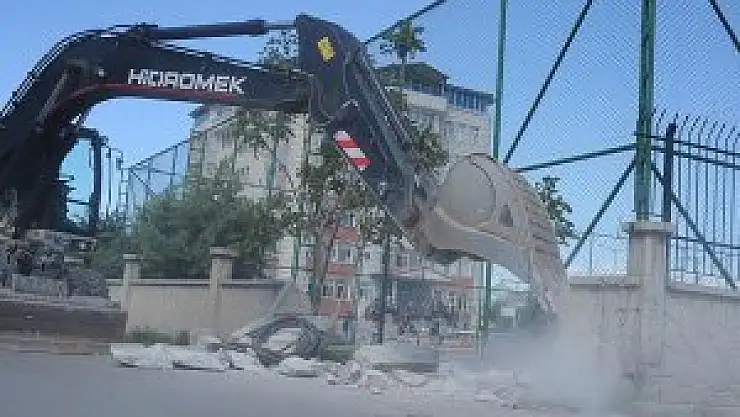 Belediye ekipleri, halı sahanın demirlerini yerinden söktükten sonra beton duvarları kepçe yardımıyla yıktı. Öğrenciler, slogan atarak yıkımı protesto etti.
