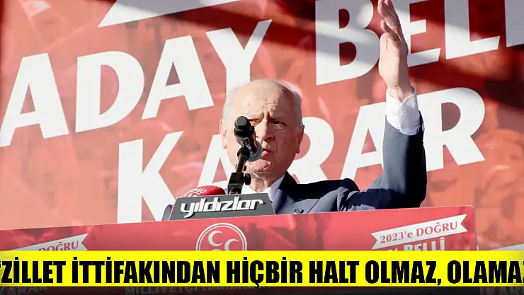 Kalabalığa seslenen Bahçeli, "İşte görsünler heybeti, işte anlasınlar haşmeti, varsın çılgına dönsünler, yeter ki kalın kafalarına soksunlar şu görkemli Kayseri gerçeğini, tanık olsunlar Milliyetçi Hareket Partisi kuvvetini. Bizi arayan anketlerde değil; dilde, duada, camide, cemevinde, bağda, bahçede, bostanda, fabrikada, tezgahta, tarlada, suskun ve vakur milyonların kalbinde arasın. Bizim yerimiz dolandırıcıların anketleri değil, kalemi satılmış gazetecilerin küf tutmuş köşeleri değil, Türk milletinin şaşmaz, sarsılmaz, asla tartışılmaz hükmü şahsiyetindedir, ancak hamiyet sahipleri bu hakikatin idrakine varabilecektir. Elbette ve her zaman varlığımız Türk varlığına bin defa armağan olacaktır. Cumhuriyet'in yüzüncü yıl dönümü olan 2023'te hem Cumhurbaşkanı seçeceğiz, hem de 28'inci Dönem Milletvekili Genel Seçimini yapacağız. Vakit yaklaştıkça zillet ittifakının ve bu ittifakın yanında yöresinde tetikçilik yapan çıkarcıların korkuya kapıldığı, uykularının kaçtığı görülmektedir" dedi.