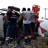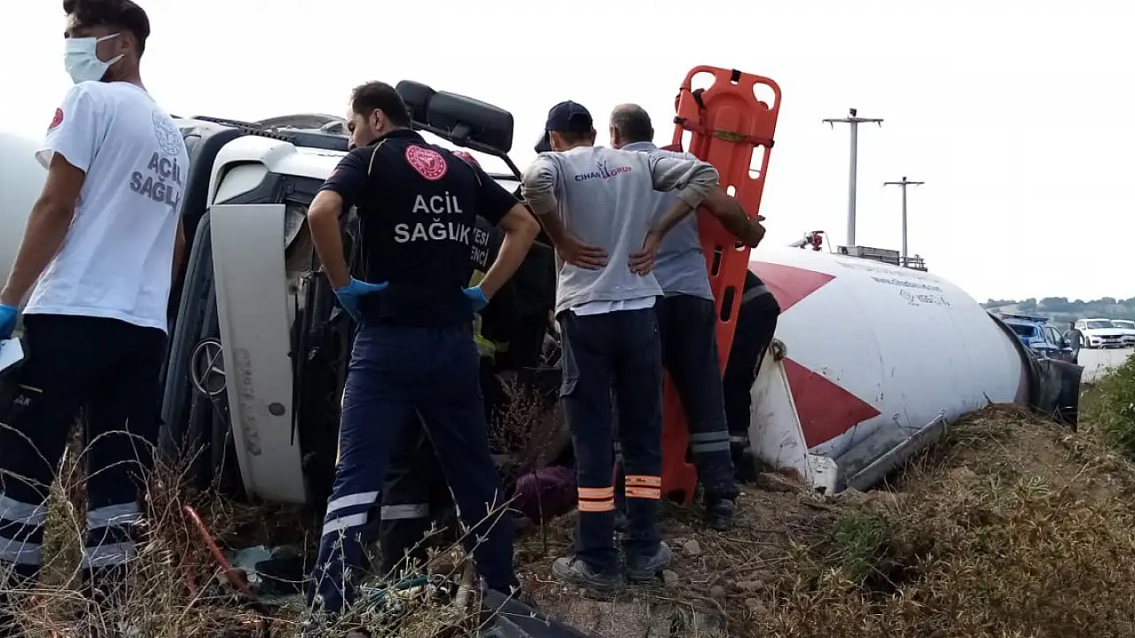 BURSA'nın İnegöl ilçesinde yoldan çıkarak tarlaya devrilen beton mikserinde yangın çıkarken, sürücü araçta sıkıştı. Yangın, yoldan geçen bir başka sürücü tarafından yangın söndürme tüpüyle söndürülürken, yaralı sürücü Mehmet Asan (64) itfaiye ekipleri tarafından kurtarıldı.