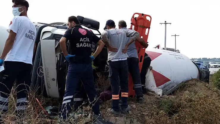 BURSA'nın İnegöl ilçesinde yoldan çıkarak tarlaya devrilen beton mikserinde yangın çıkarken, sürücü araçta sıkıştı.
