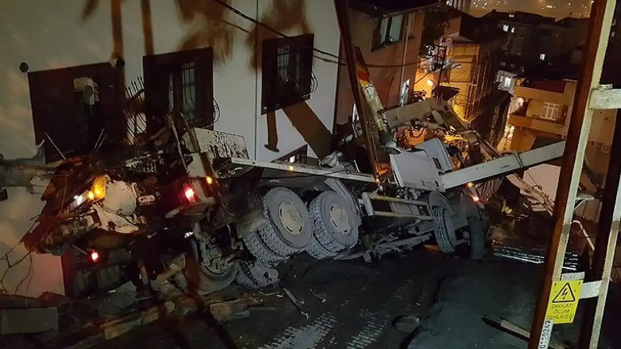 Kâğıthane'deki bir şantiyede temel atma çalışmaları sırasında beton pompası kayarak etrafta bulunan apartmanların duvarına çarparak yan yattı.