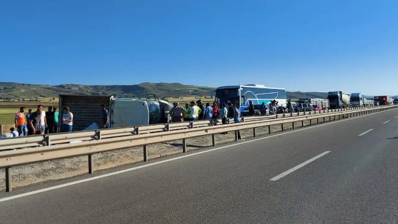 SİVAS'ta kamyonetin devrildiği kazada 2 kişi yaralanırken, Sivas- Kayseri karayolunun tek şeridi 1 saat ulaşıma kapandı, 1 kilometrelik araç kuyruğu oluştu.