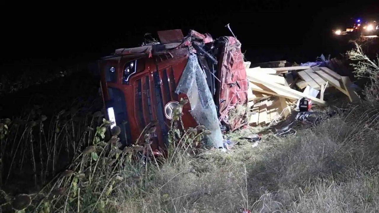 Afyonkarahisar'da şarampole devrilen kereste yüklü tırın sürücüsü hayatını kaybetti.