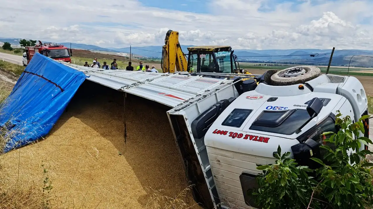AMASYA'da, sürücünün direksiyon hakimiyetini kaybettiği buğday yüklü TIR devrildi. Sürücünün yaralandığı kazada tonlarca buğday yol kenarına döküldü.