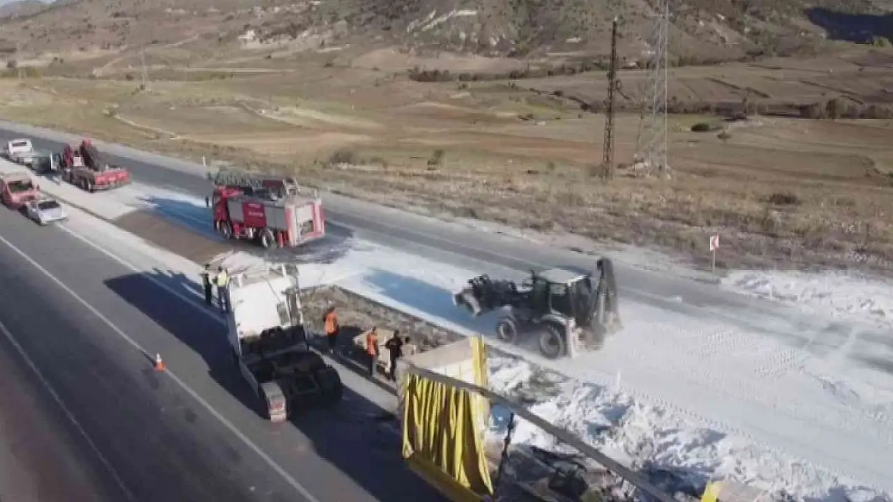Afyonkarahisar'da sürücüsünün kontrolünü kaybettikten sonra devrilen tırdan yola dağılan tonlarca nişasta iş makineleri ile güçlükle temizlendi.