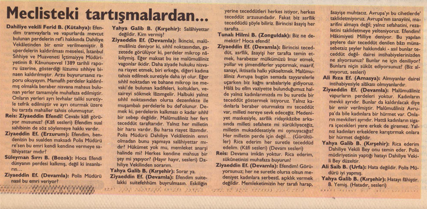 Burada, tramvaylarda kadın ve erkeklerin arasını ayıran perdelerin kaldırılması gerektiğini, çünkü bunların hijyenik olmadığını savunanlar ve onlara cevap veren meb’uslar arasındaki tartışmadan bir kesit var (Bkz. II. Devre Zabıt Ceridesi, c. XIV, s. 137-139). Allah aşkına söyleyin, günümüzde bile bindiğimiz otobüs, trarmvay gibi toplu taşıt araçlarının neresi hijyenik ki? Koltuk örtüleri kaç yılda bir yenileniyor acaba? Sadece bazıları, tek tedbir olarak başın yaslandığı kısma, değiştirilebilir örtüler örtüyorlar o kadar…İyi de o zaman toplu taşıma araçlarını yasaklayalım mı? Olacak iş mi bu?