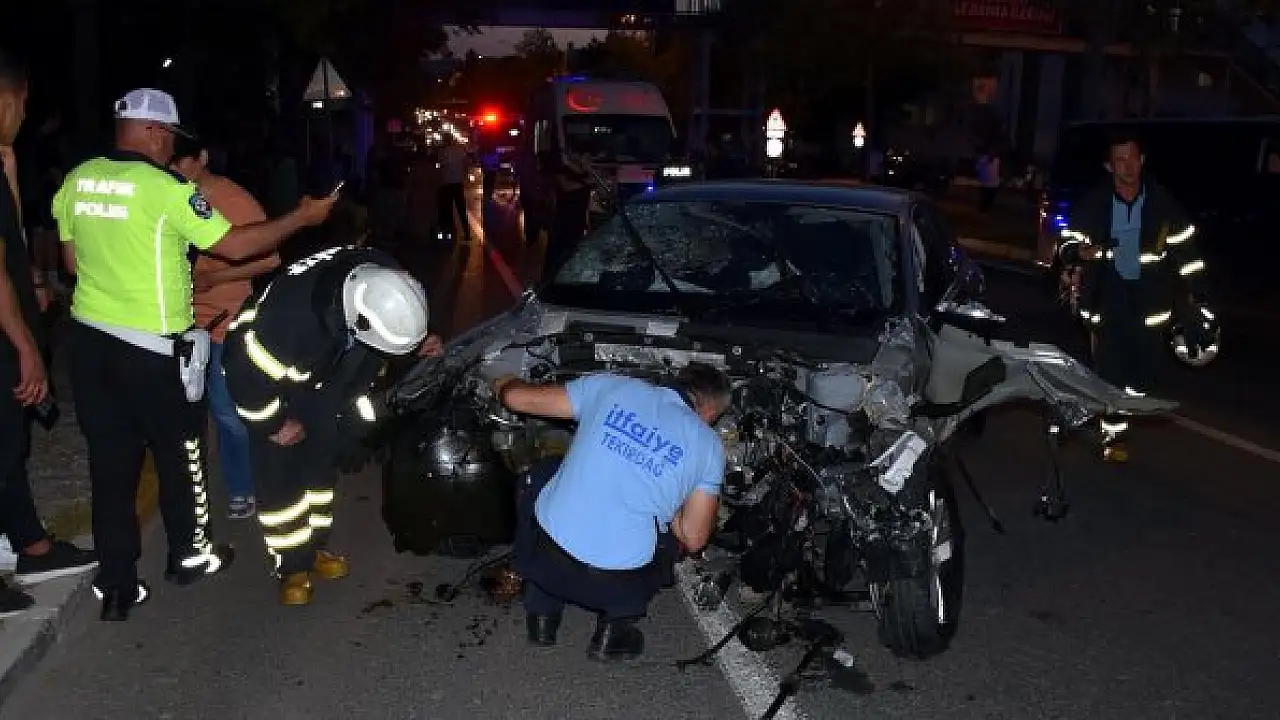 TEKİRDAĞ'da kontrolden çıkıp üst geçit direğine çarpan otomobilin motoru yerinden fırladı.