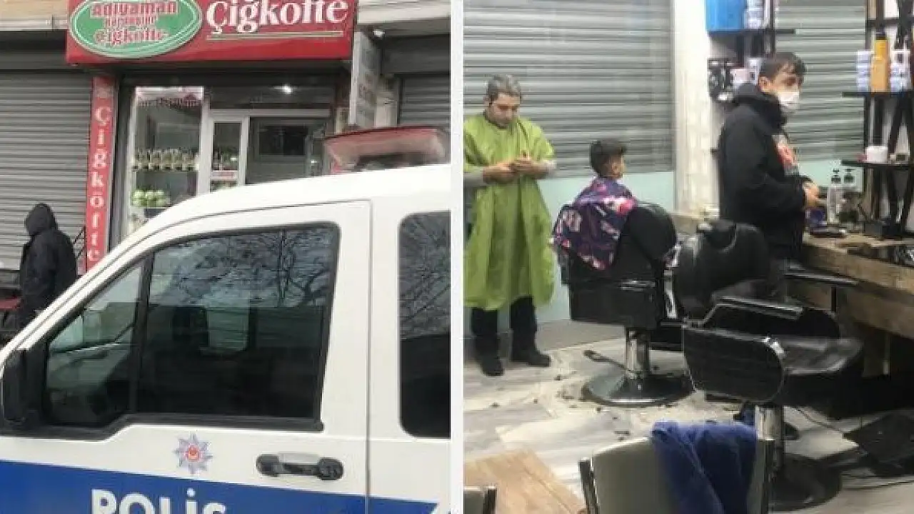Bitişiğindeki çiğ köfteciden kapı açarak müşteri alan berber dükkanına baskın yapıldı. İçerideki 4 kişiye koronavirüs tedbirlerine uymamaktan para cezası kesildi.