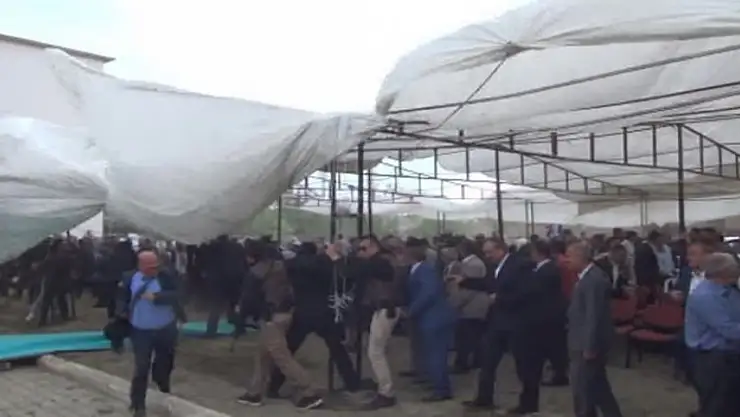 Van’da düzenlenen temel atma töreninde aniden bastıran fırtına nedeniyle platformun kısmen çökmesi sonucu Diyanet İşleri Başkanı Mehmet Görmez’in de aralarında bulunduğu çok sayıda davetli adeta ölümden döndü.