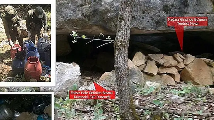 Valiliğin açıklamasına göre, İl Jandarma Komutanlığı ekiplerince düzenlenen Şehit Jandarma Astsubay Çavuş Metin Uysal Operasyonunu kapsamında ilçe kırsalında yapılan aramada, üç odalı bir mağarada yaklaşık 20 kilogram amonyum nitrat ve şeker kullanılarak, 4 piknik tüpüne hazırlanmış basma düzenekli el yapımı patlayıcı ile 515 kilogram gıda malzemesi bulundu.