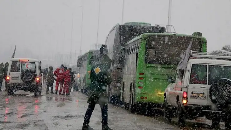 Buna karşılık, muhaliflerin kuşatmasında bulunan İdlib'in Fua ve Keferya beldelerinden 4 otobüslük bir konvoy yola çıktı. Rejim yanlısı yabancı teröristlerin kontrolündeki iki beldeden çıkanlar, rejimin hakimiyetindeki Halep kent merkezinin batısına ilerliyor.