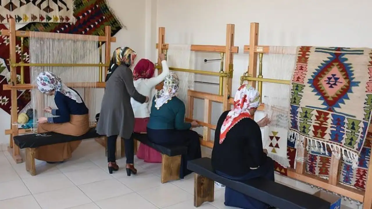 Halk Eğitim Müdürlüğü bünyesinde, belde belediyesinin desteği ile açılan kilim dokuma kursuna katılan 12 kadın, hem meslek öğreniyor hem de yaptıkları ürünlerin satışından gelir elde ediyor.