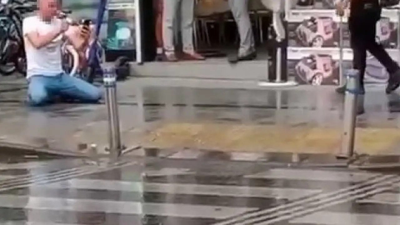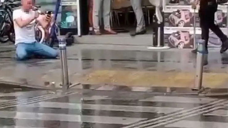 Zeytinburnu'nda psikolojik sorunları olduğu iddia edilen kişi, bir mağazanın önünde "bunlar beni dolandırdı" diye bağırarak boynunu kesmeye çalıştı. O anlar vatandaşlar tarafından cep telefonu kameraları tarafından kaydedildi.