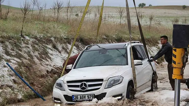 Dolu yağışından dolayı kayan otomobil su kanalına düştü