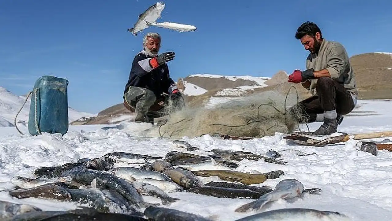 Günün ilk ışıklarıyla yüzeyi buz tutan göle gelen balıkçılar, kazma, kürek ve demir çubuklarla buzu kırarak ağlarla sazan, alabalık ve ıstakoz tutuyor.