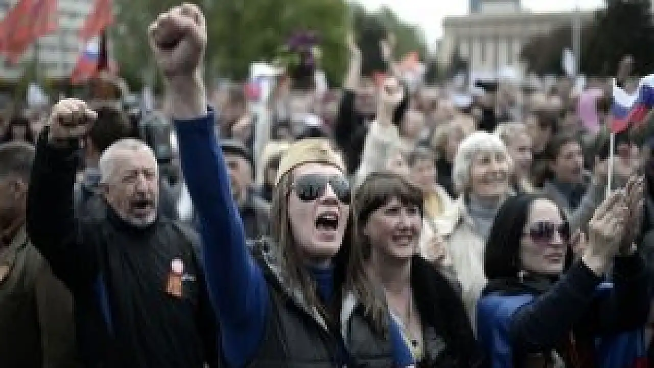 Lenin Meydanı’nda toplanan Rusya bayrakları taşıyan yaklaşık 2 bin kişilik kalabalık, “Bağımsız Donbass” sloganları atarak Kiev yönetimini ve orduyu protesto etti.
