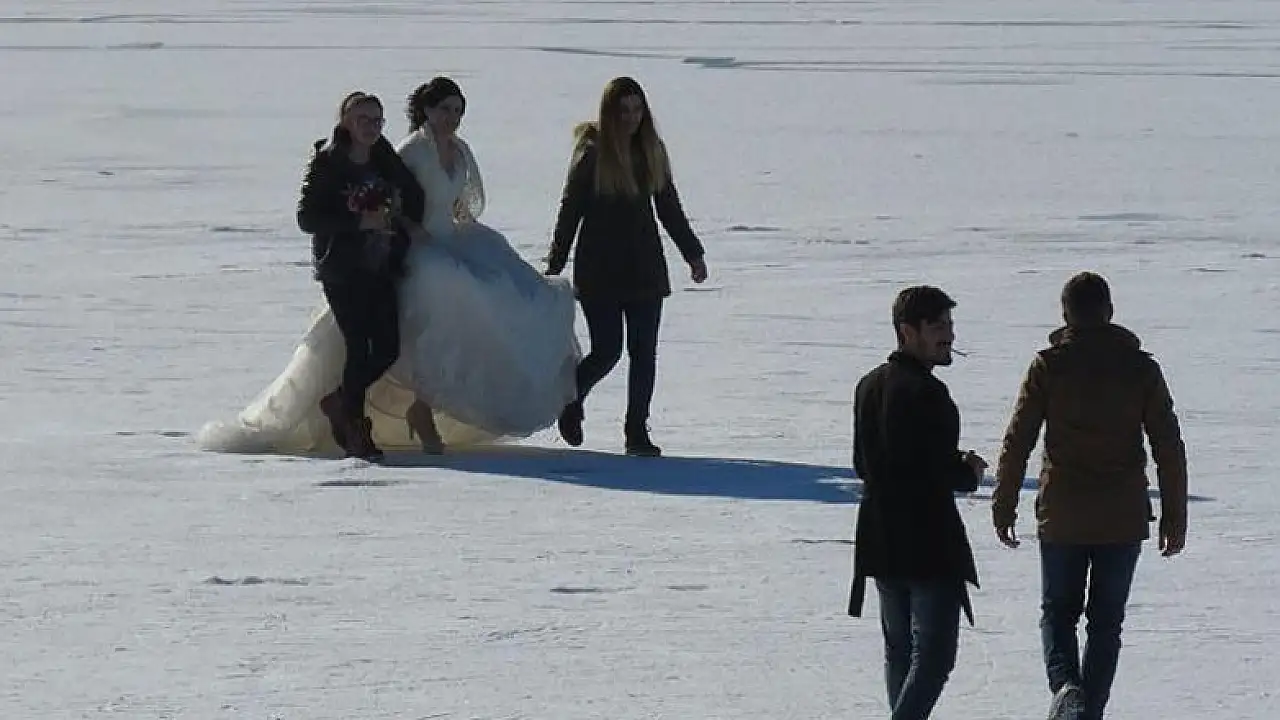 Konya'nın Beyşehir ilçesinde donan göl yüzeyinde buz tabakasının giderek kalınlaşmasından cesaret bulan bir çift, yasak olmasına rağmen gölün üzerinde gelinlik ve damatlığıyla yürüdü.