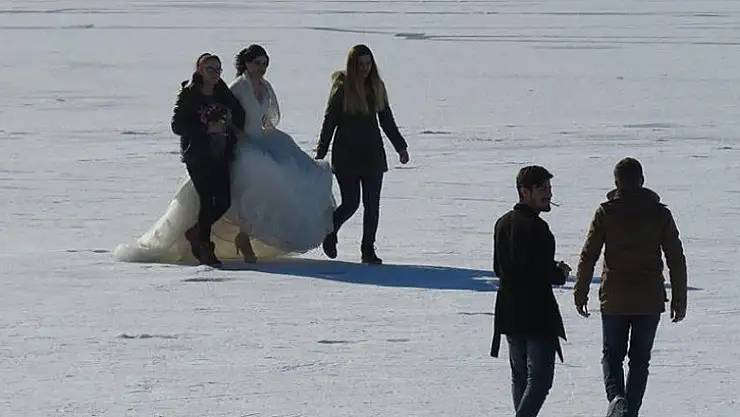 Bir çift ise, gelinlik ve damatlığıyla gölün üzerine çıktı. Çifti görenler ise şaşkınlıklarını gizleyemedi. Donmuş göl üzerinde fotoğrafçısına poz veren çift, Vuslat Parkı kıyısından Aşk Adası’na kadar yürüdü.