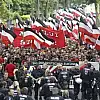 Yürüyüş esnasında yaklaşık 300 aşırı sağcı, Nazilerin kullandığı kırmızı siyah ve beyaz renkli flamalar taşıdı.