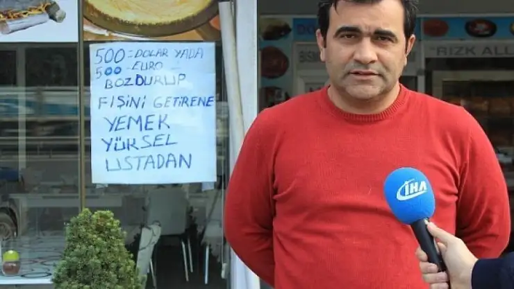 İşletme sahibi Yüksel Yıldırım, vatandaşlara dövizlerini bozmaları konusunda çağrı yaparak, başlattıkları kampanyayı anlattı. Yıldırım, “Ülkemize ve devletimize hizmet amaçlı bir kampanya yaptık. Biliyorsunuz sayın Cumhurbaşkanımızın da 'Dolarlarınızı bozun' diye bir çağrısı olmuştu. Dolarlarını, Euro’larını bozan tüm vatandaşlarımız makbuzlarıyla geldiği zaman lokantamızda ücretsiz yemek yiyebilirler. Bozdurdukları dövizin fişiyle gelen çok vatandaş oldu. Dün bu kampanyaya başladık, gördük ki vatandaşlarımız sayın Cumhurbaşkanımızın ve bizim bu kampanyamıza, çağrımıza duyarsız kalmamış. Bayağı ilgi var” diye konuştu.