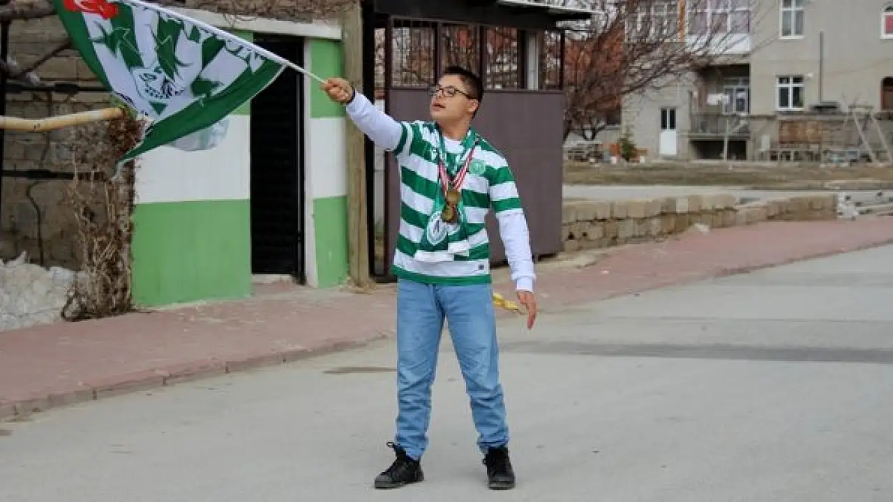 Evi ve odası, taraftarı olduğu Konyaspor'un renkleri olan yeşil ve beyaza boyanan down sendromlu Ebubekir Tepe, tutkunu olduğu takımla hayata hep gülümsüyor.