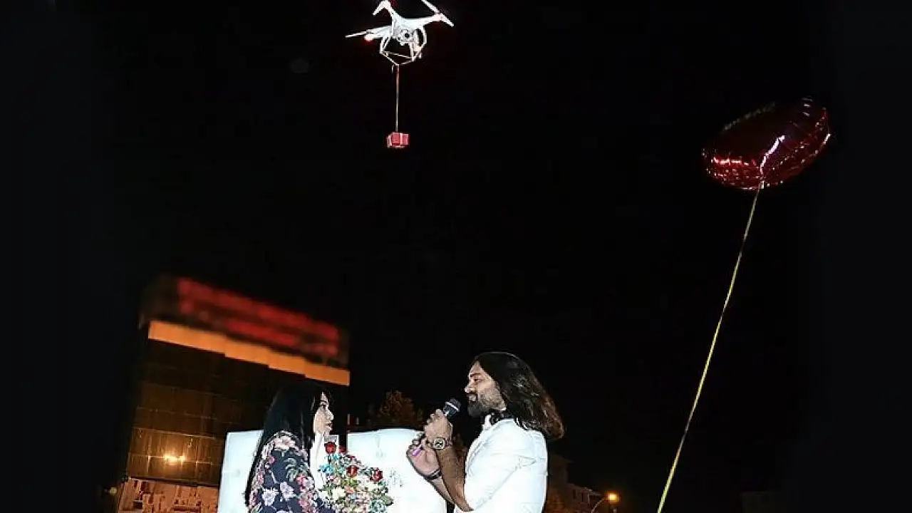 Karabük'ün Safranbolu ilçesinde bir genç, kız arkadaşına drone (insansız hava aracı) ile indirdiği yüzüğü vererek evlenme teklifi yaptı.