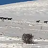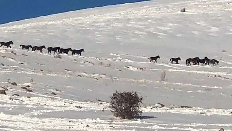 Sivas'ta DKMP ekiplerinin yem bıraktığı alana gelen yılkı atları drone kamerasına takılırken, atların bembeyaz alanda koşması renkli görüntülere sahne oldu.