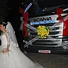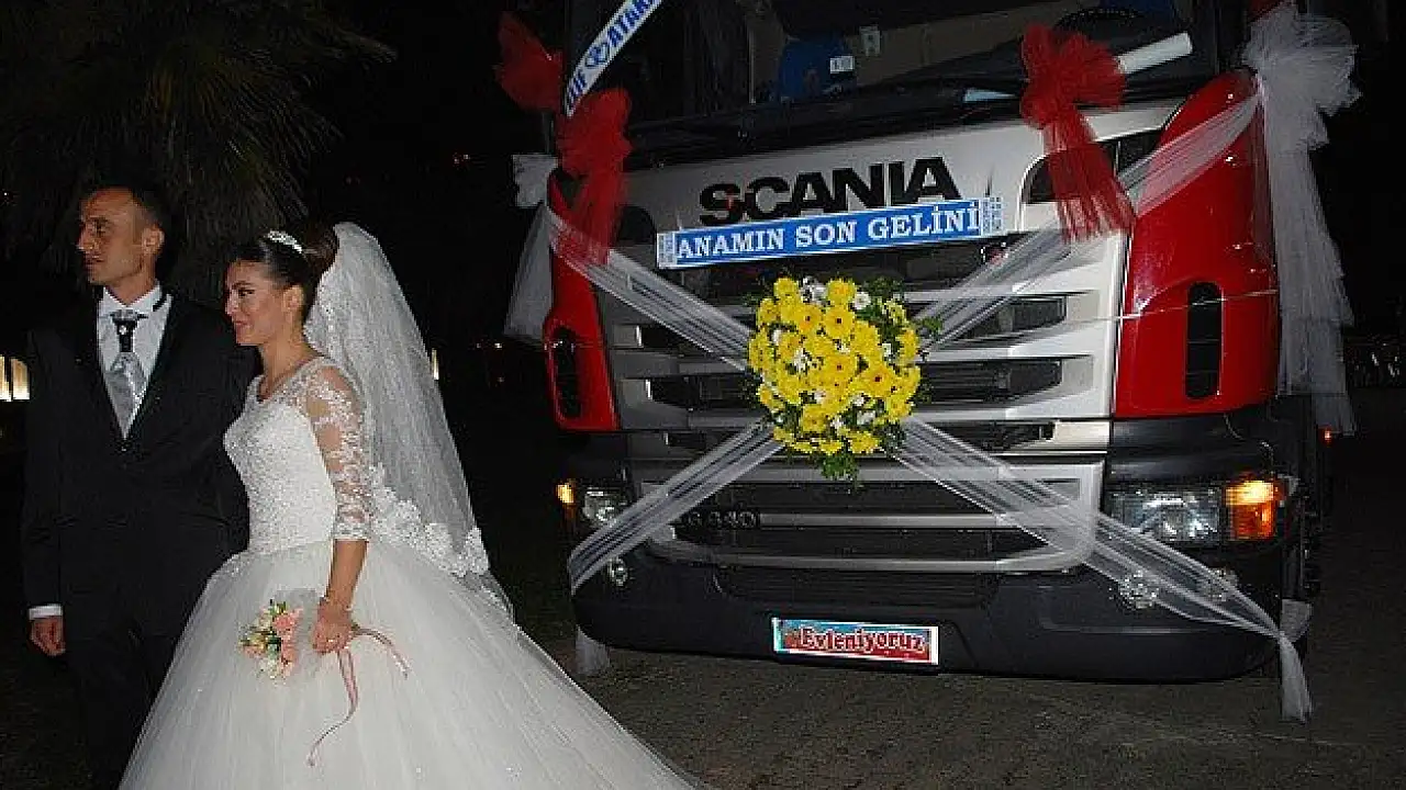 Tır şoförü damat Atakan Karaaslan ve gelin Elif Palavar çifti, gelin arabası olarak tırın çekicisini tercih etti. Renkli şeritler ve çiçeklerle süslenen çekicinin direksiyonuna geçen Karaaslan, kendisine eşlik eden arkadaşlarının kullandığı 20 çekiciyle konvoy halinde ilçenin cadde ve sokaklarını turladı.