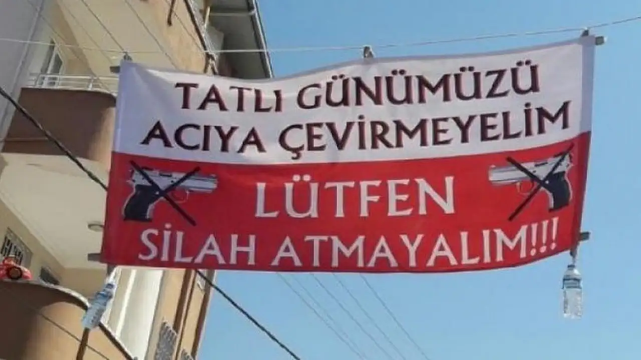 Osmaniye'de 52 yaşındaki Mustafa Çankal, oğlunun düğününde, havaya silahla ateş edilmesinin önüne geçmek için üzerinde, "Tatlı düğünümüzü acıya çevirmeyelim. Lütfen silah atmayalım" yazılı pankartı evinin önündeki sokağa koydu.