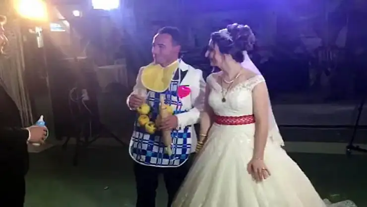 Tekirdağ'ın Malkara ilçesinde Celal Damarlı (32) ile Didem Çolak'ın(27) düğünlerinde arkadaşları damada mutfakta kullanması için önlük, hamur açması için merdane, süt, biberon gibi eşyalar taktı.