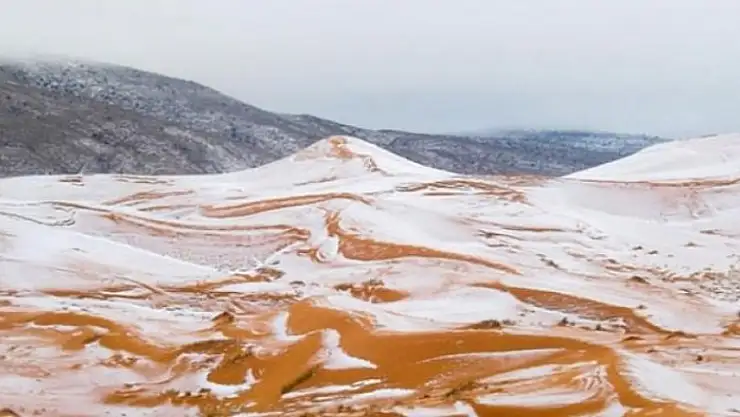 Geçen sene Sahra Çölü'ne 37 yıl aradan sonra kar yağmıştı. Çok nadir gerçekleşen kar yağışı, ünlü Atlas Dağları'nın kenarında yer alan bölgede görülmüştü. Turuncu tepelerin bembeyaz örtüyle kaplandığı fotoğraflar, dünya medyasında ses getirmişti.