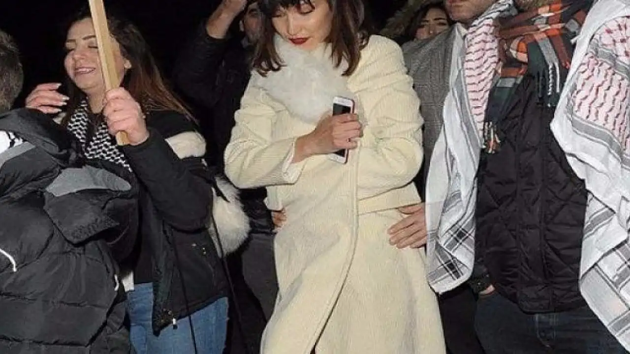 Babası Filistinli olan ve daha önce Müslüman olduğunu açıklayan 21 yaşındaki model, göstericilerle birlikte yürüyerek slogan attı.