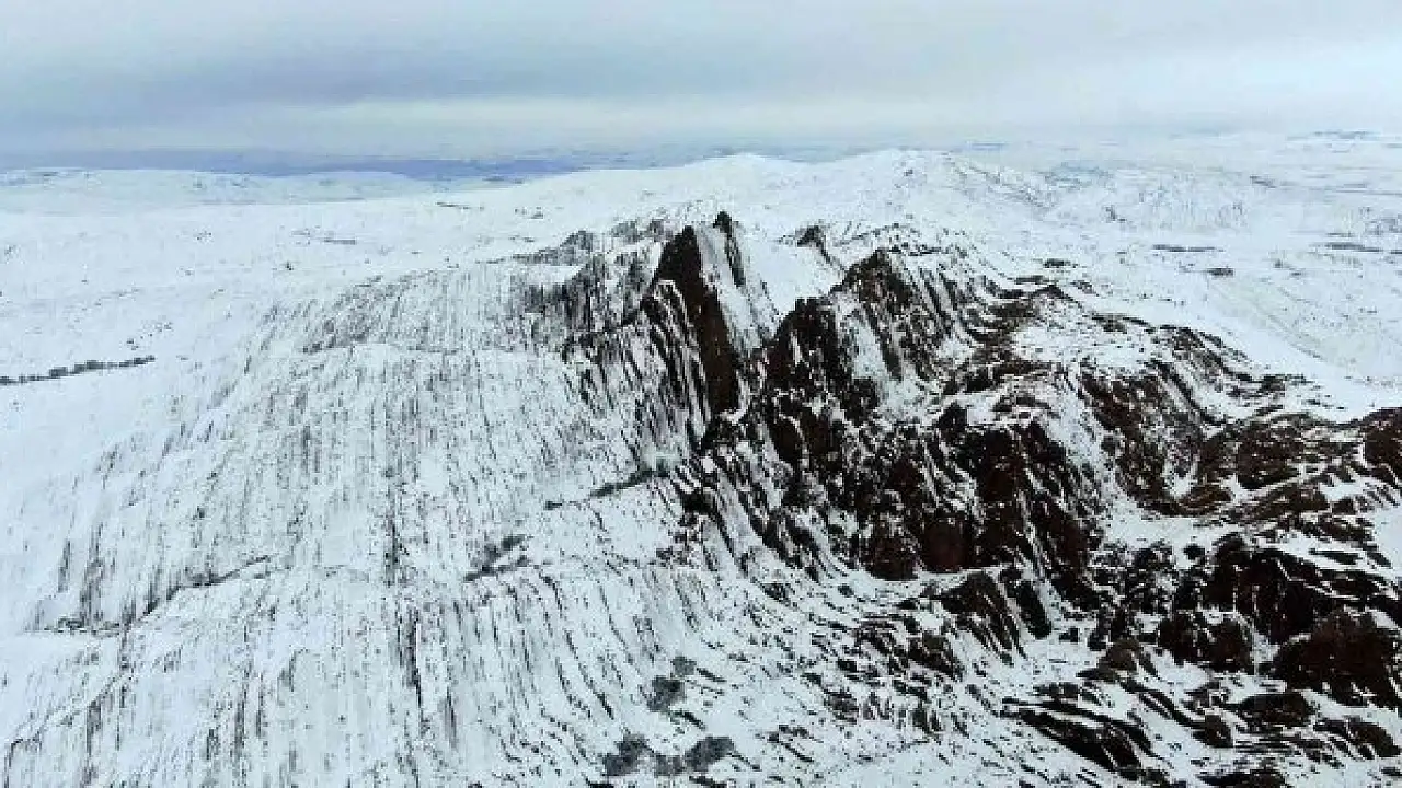 Sivas'ta kızıl rengiyle görenlerin dikkatini çeken ve Dünyadaki mars olarak bilinen Eğribucak-Emirhan kayalıkları kar yağışının ardından beyaza büründü