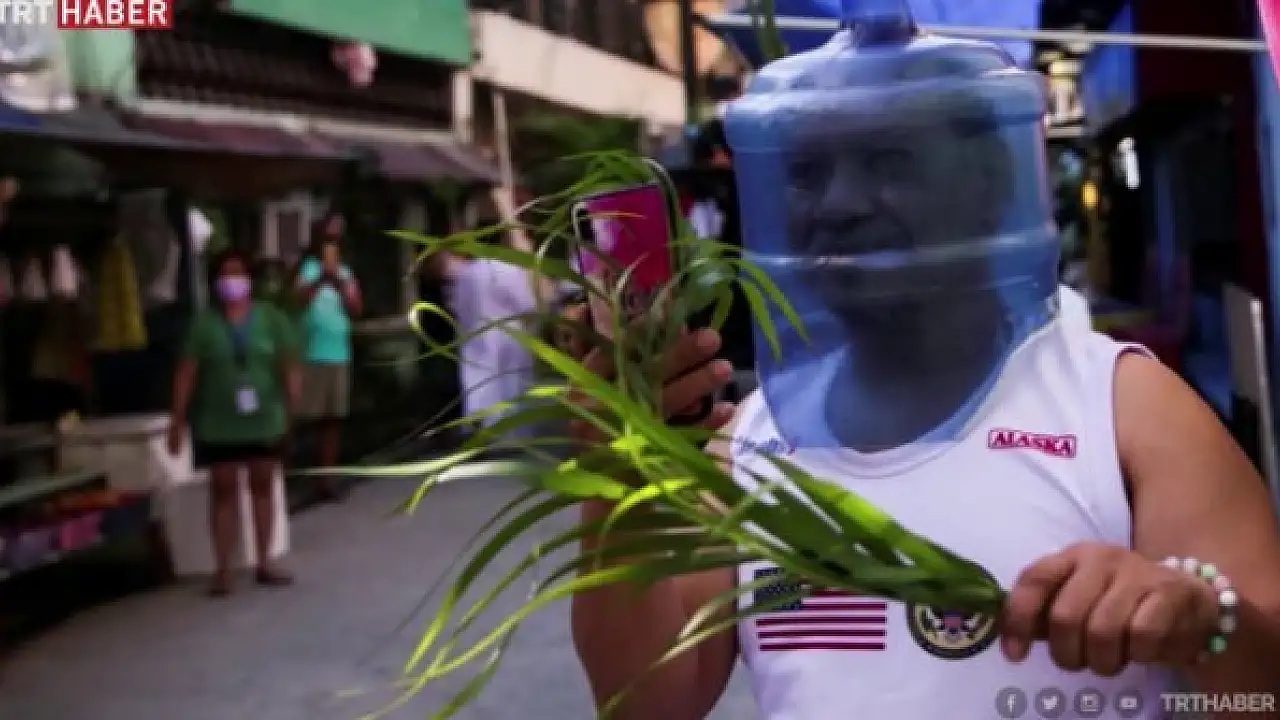 Maske yerine damacanadan yararlandı. Bir Filipinli, koronavinrüsten korunmak için kafasını damacananın içine soktu.