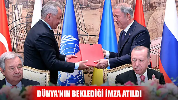 Cumhurbaşkanı Erdoğan ve BM Genel Sekreteri Guterres'in hazır bulunduğu; Dışişleri Bakanı Mevlüt Çavuşoğlu, Milli Savunma Bakanı Hulusi Akar, Rusya Savunma Bakanı Sergey Şoygu ve Ukrayna Altyapı Bakanı Aleksandr Kubrakov'un katıldığı Tahıl Sevkiyatı Anlaşması imza töreni, Cumhurbaşkanlığı Dolmabahçe Ofisi'nde gerçekleştirildi.