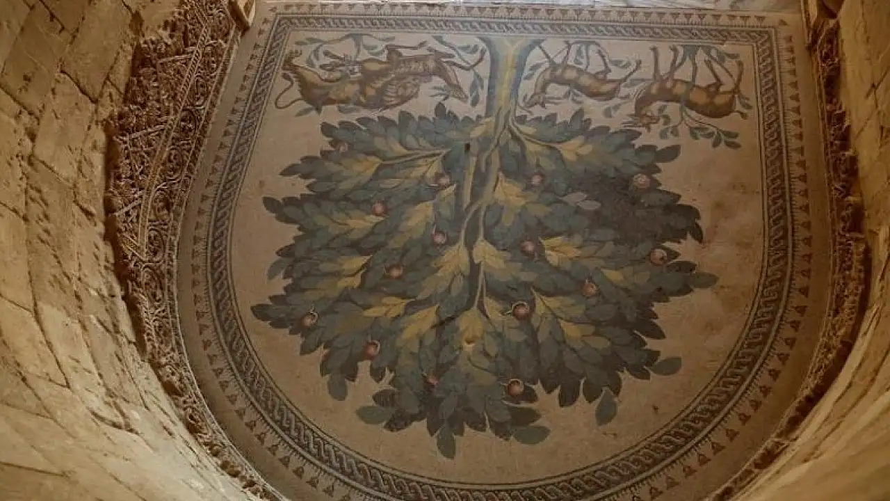Hişam Sarayı’nın banyosunun zemininde yer alan tablo, “Hayat Ağacı” olarak isimlendiriliyor. Tabloda, bir ağacın etrafında bulunan üç ceylandan biri, aslan tarafından avlanırken diğer ikisinin huzurlu şekilde hayatına devam ettiğini anlatan bir tasvir yer alıyor. Mozaikteki bu tasvirin savaş ve barışı anlattığı söyleniyor.