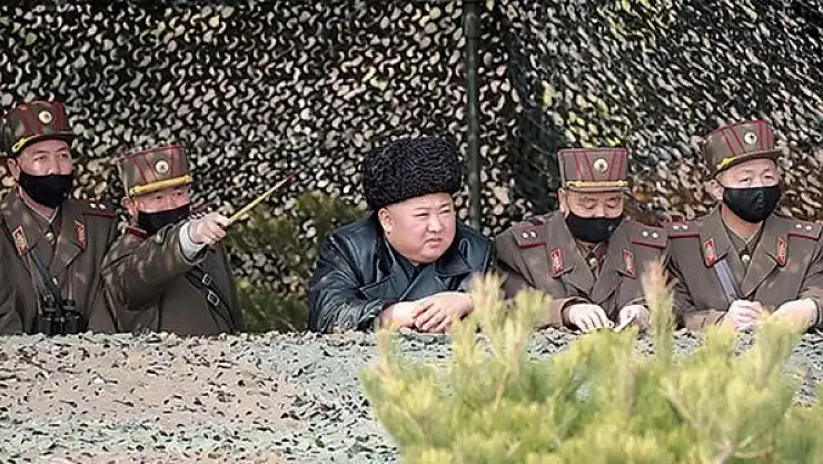 Ülkenin resmi haber ajansı KCNA, 'nın dün düzenlenen askeri tatbikattan servis ettiği fotoğrafta, Kuzey Kore lideri Kim Jong Un, henüz virüsle bağlantılı ölüm açıklamayan ülkesinde etrafındaki 6 askerin aksine yine maske takmadan görüntülendi.