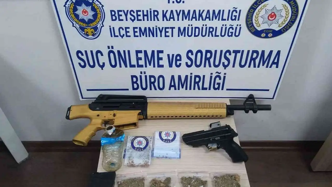 Edinilen bilgiye göre, Beyşehir İlçe Emniyet Müdürlüğü Suç Önleme ve Soruşturma Büro Amirliği ekipleri, Dalyan Mahallesi Recep Bilginer Caddesi üzerinde devriye görevi ifa ettiği sırada durumundan şüphelendiği bir araç ile içerisindeki 3 kişiyi incelenmek için İlçe Emniyet Müdürlüğüne götürdü. Alınan arama kararına istinaden araçta yapılan aramada siyah poşet içerisinde 4 adet kilitli poşette toplam daralı ağırlığı 55,89 gram esrar maddesi, 1 ruhsatsız tabanca ve şarjörü, şarjöre takılı 6 adet 9 milimetre çapında tabanca mermisi, 1 ruhsatsız av tüfeği ve şarjörü ile 1 uyuşturucu kullanma aparatı ele geçirildi. Gözaltına alınan 3 şüpheli, uyuşturucu ticareti, uyuşturucu kullanma ve ruhsatsız silah bulundurma suçlarından adliyeye sevk edildi. Şüpheliler M.S. ile M.Ş. savcılık tarafından ifadelerinin alınması sonrasında serbest bırakılırken, M.Ö. sevk edildiği sulh ceza hakimliğince tutuklanarak Seydişehir T Tipi Kapalı Cezaevi'ne gönderildi.