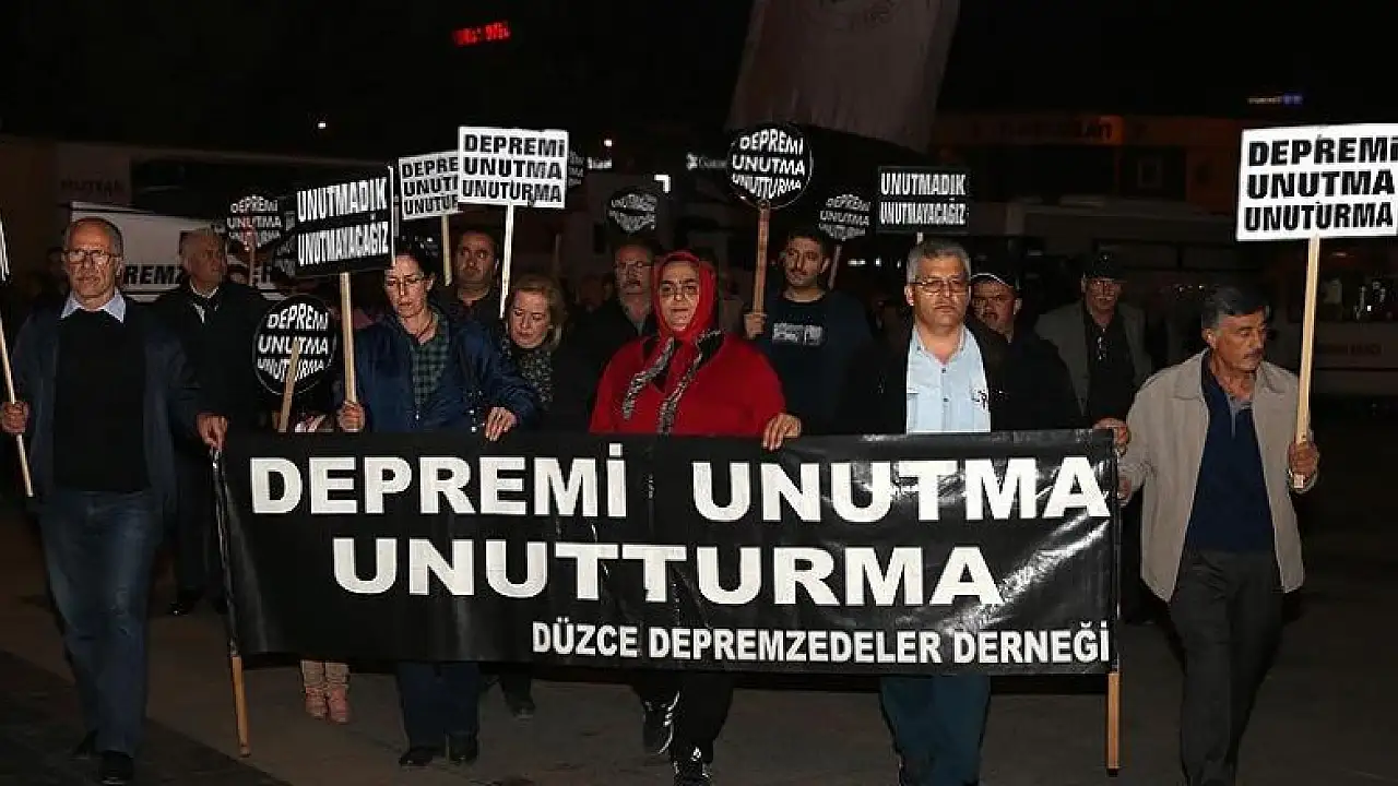 Ellerindeki, ''Depremi unutmadık, unutturmayacağız'' ve ''Sağlam binalar istiyoruz'' yazılı dövizleri taşıyan Düzce Depremzedeler Derneği (DEPDER) üyeleri ile vatandaşlardan oluşan grup, Atatürk Anıtı'na kadar yürüdü.