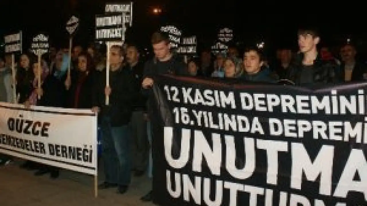 16 yıl önce 7.2 büyüklüğündeki depreminin meydana geldiği saat 18.58’e kısa bir süre kala Düzce Depremzedeler Derneği üyeleri, ellerinde taşıdıkları ’Depremi Unutma, Unutturma’ yazılı dövizlerle slogan atarak Anıtpark’a geldi. Grup, deprem saatinde ise 2 dakikalık saygı duruşunda bulundu.