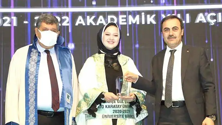 KTO Karatay Üniversitesi 2019-2020 & 2020-2021 Mezuniyet Töreni ve 2021-2022 Akademik Yıl Açılışı gerçekleşti. Üniversite birincisi olarak mezun olmanın heyecanını yaşayan Sağlık Bilimleri Yüksekokulu Beslenme ve Diyetetik Bölümü mezunu Ayşegül Çeçen, ödülünü Başkan Öztürk ve Rektör Sade'nin elinden aldı.
