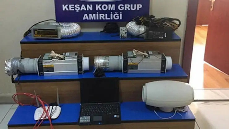 Narkotik Suçlarla Mücadele Şube Müdürlüğünden alınan bilgiler doğrultusunda Keşan KOM Grup Amirliğiekiplerince Uzunköprü Cumhuriyet Başsavcılığından alınan arama kararına göre Edirne’nin Meriç ilçesine bağlı Kavaklı köyündeki bir evde arama gerçekleştirildi. Yapılan aramalarda ikametin üst katında dışarıda bulunan trafodan kaçak olarak kablo çekilmek suretiyle güç verilerek laptop bilgisayara bağlandığı ve yapılan incelemede bitcoin üretim düzeneği olduğu anlaşılan düzenek bulunduğu tespit edildi.