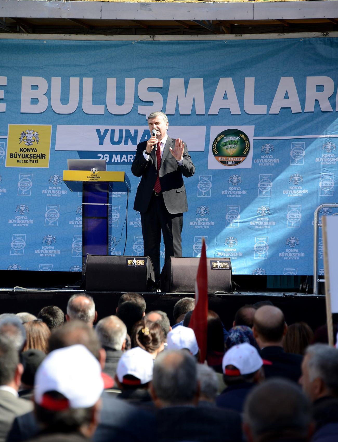 İlçe Buluşmaları kapsamında Yunak'ta binlerce kişilik coşkulu topluluğa hitap eden Büyükşehir Belediye Başkanı Tahir Akyürek, son 3 yılda Yunak'a 54 milyon lira tutarında yatırım yaptıklarını belirterek, hayırlı olmasını diledi.