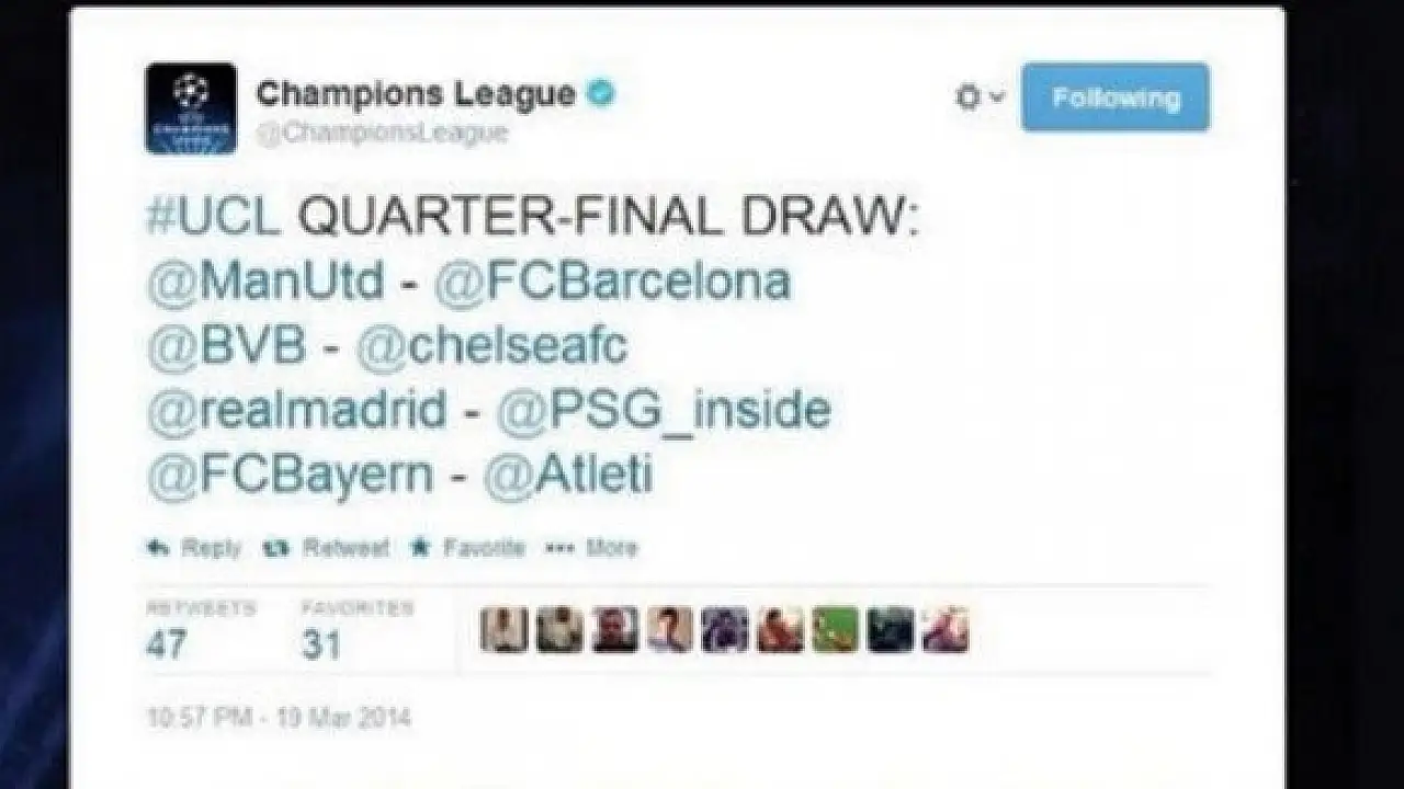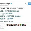 Şampiyonlar Ligi'nde çeyrek finale kalan takımlar belli oldu. Herkes eşleşmeleri beklerken atılan bir tweet ortalığı karıştırdı. Önceki akşam oynanan maçların ardından Şampiyonlar Ligi resmi Twitter hesabı kuralar çekilmeden çeyrek finale kalan takımları eşleştirdi; bu durum gündeme bomba gibi düştü. 'Football lists' adlı adresin resimli olarak attığı tweette Şampiyonlar Ligi resmi Twitter hesabından çeyrek finale kalan takımların eşleştirildiği tweetinin atıldığı, sonradan silindiği belirtildi. Daha önce birkaç eşleşme de kura çekimi öncesinde yayınlanmış ve kuraların bire bir tutmasıyla 'acaba her şey önceden planlanıyor mu?' sorularını beraberinde getirmişti. Bu iddialar çoğalınca UEFA'nın güvenilirliği sarsılmıştı.