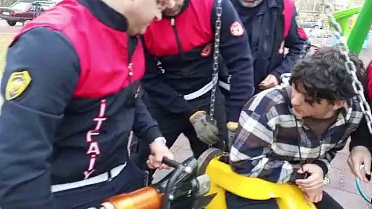 Sivas'ta çocuk parkında bindiği salıncakta sıkışan genci itfaiye ekipleri kurtardı.