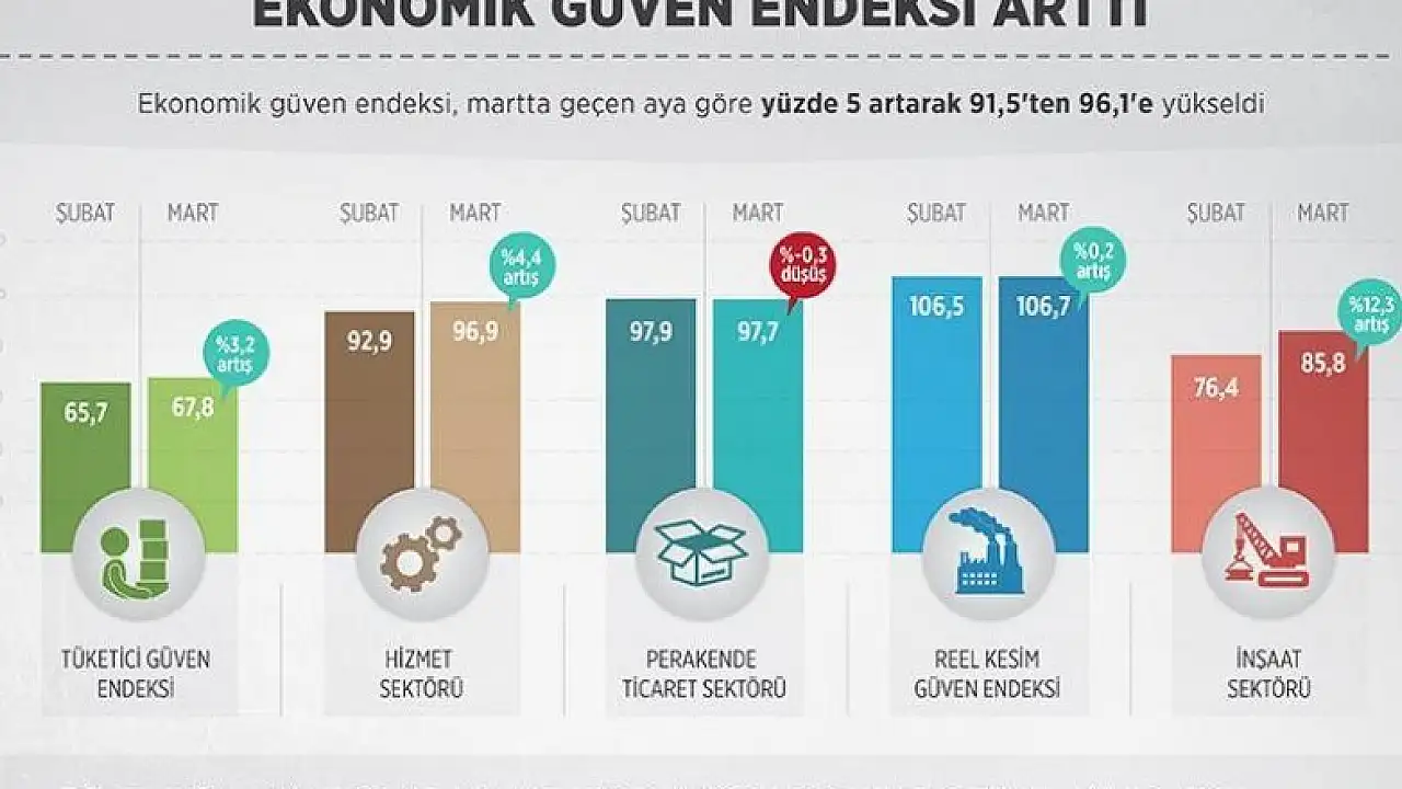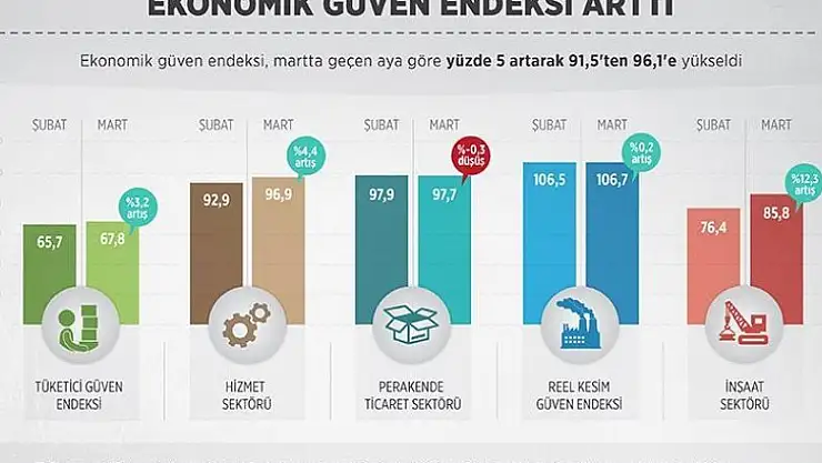 Buna göre, ekonomik güven endeksi martta geçen aya göre yüzde 5 artışla 91,5 değerinden 96,1'e yükseldi. Ekonomik güven endeksindeki artış, inşaat sektörü, hizmet sektörü, tüketici ve reel kesim (imalat sanayi) güven endekslerindeki artışlardan kaynaklandı.