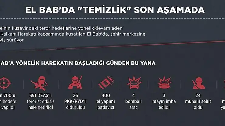 Harekatta El Bab'ın teröristlerden arındırılmasına yönelik çalışmalar yaklaşık 1,5 aydır devam ediyor. Bu çerçevede, şehrin kuşatılmasının ardından İnsansız Hava Araçları (İHA) ile keşif uçuşları yapıldı, daha sonra El Bab ve çevresindeki terör hedefleri, Fırtına obüsleri ve savaş uçaklarıyla vuruldu.